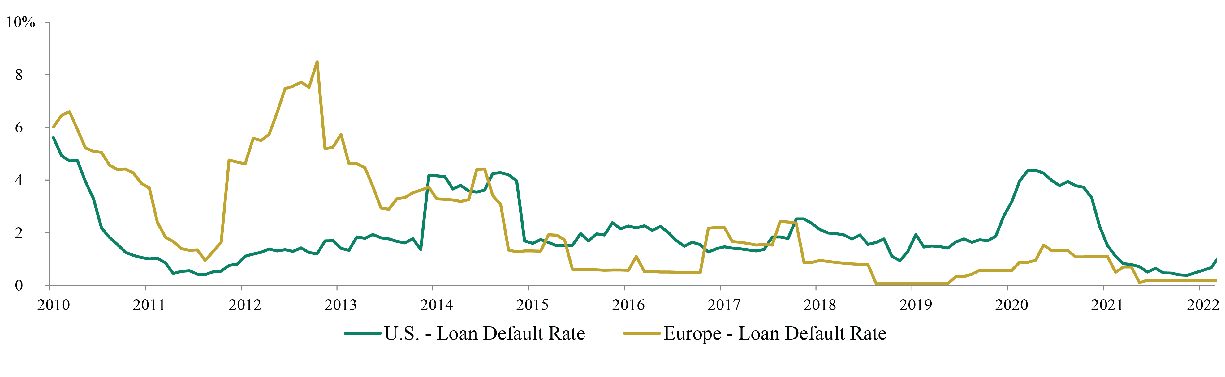 Figure 2: Loan Default Rates Remain Low in the U.S. and Europe